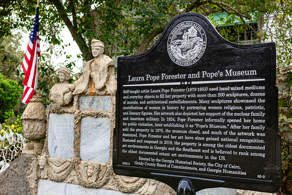 Her artwork and message received notable public support during her lifetime, with recognition in publications like the Atlanta Journal-Constitution, Macon Telegraph, and the Albany Herald. However, it gained even more prestige after her death. In 1977, an exhibit with over one hundred photographs of Pope’s Museum was created in collaboration with the United States Library of Congress. In 1983, Smithsonian Magazine featured her as an innovative and impactful outsider artist, and the New Georgia Encyclopedia recognized her as one of Georgia’s earliest self-taught outdoor art environments. Most recently, in 2020, Laura Pope Forester’s museum/home qualified for the United States National Register of Historic Places in categories such as Art, Recreation and Leisure, and Women’s History.